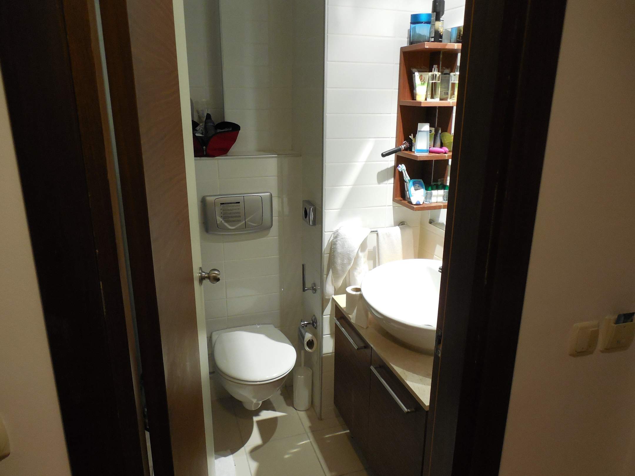 Hinter der Tür links ist gleich die Dusche!!! Für zwei Personen unmöglich!