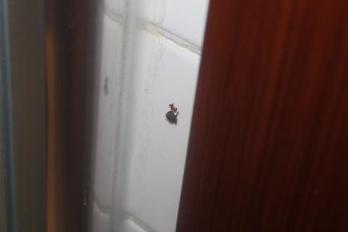 Kot an der Wand hinter der Tür im Bad