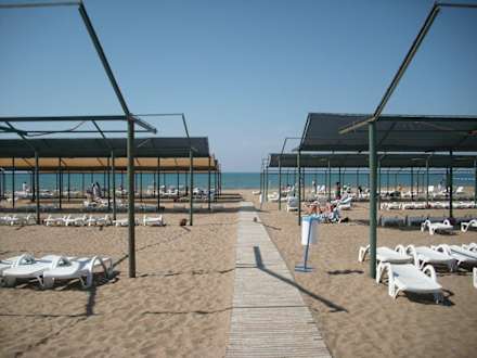 Hotelstrand mit Steg und Sonnensegeln