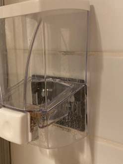 Dreckiger Seifenspender in der Dusche