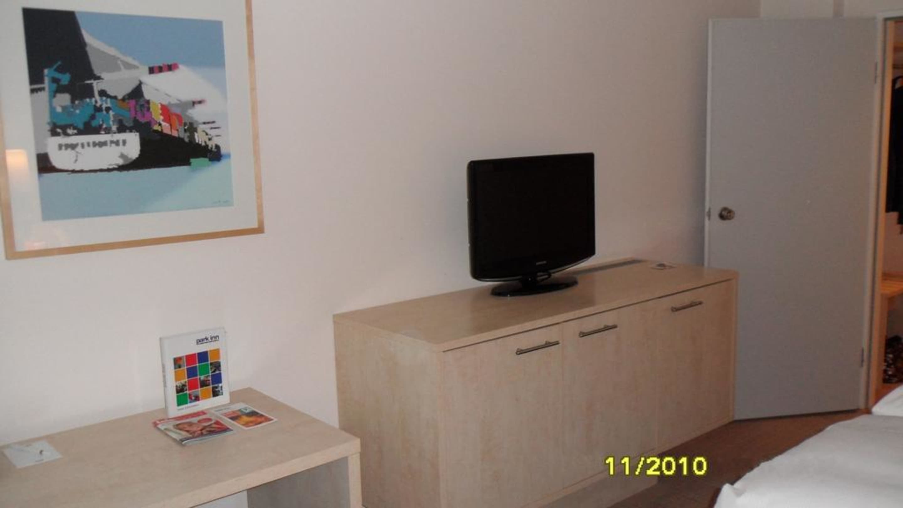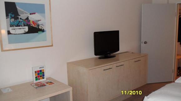 28.11.2010 - Zimmer 129 Blick vom Doppelbett aus gesehen auf Flachbild-TV, rechts erkennbar die Tür zum kleinen Vorflurbereich