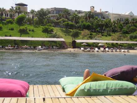 Stranansicht vom Steg aus. Mit Riesen-Kissen als Steg