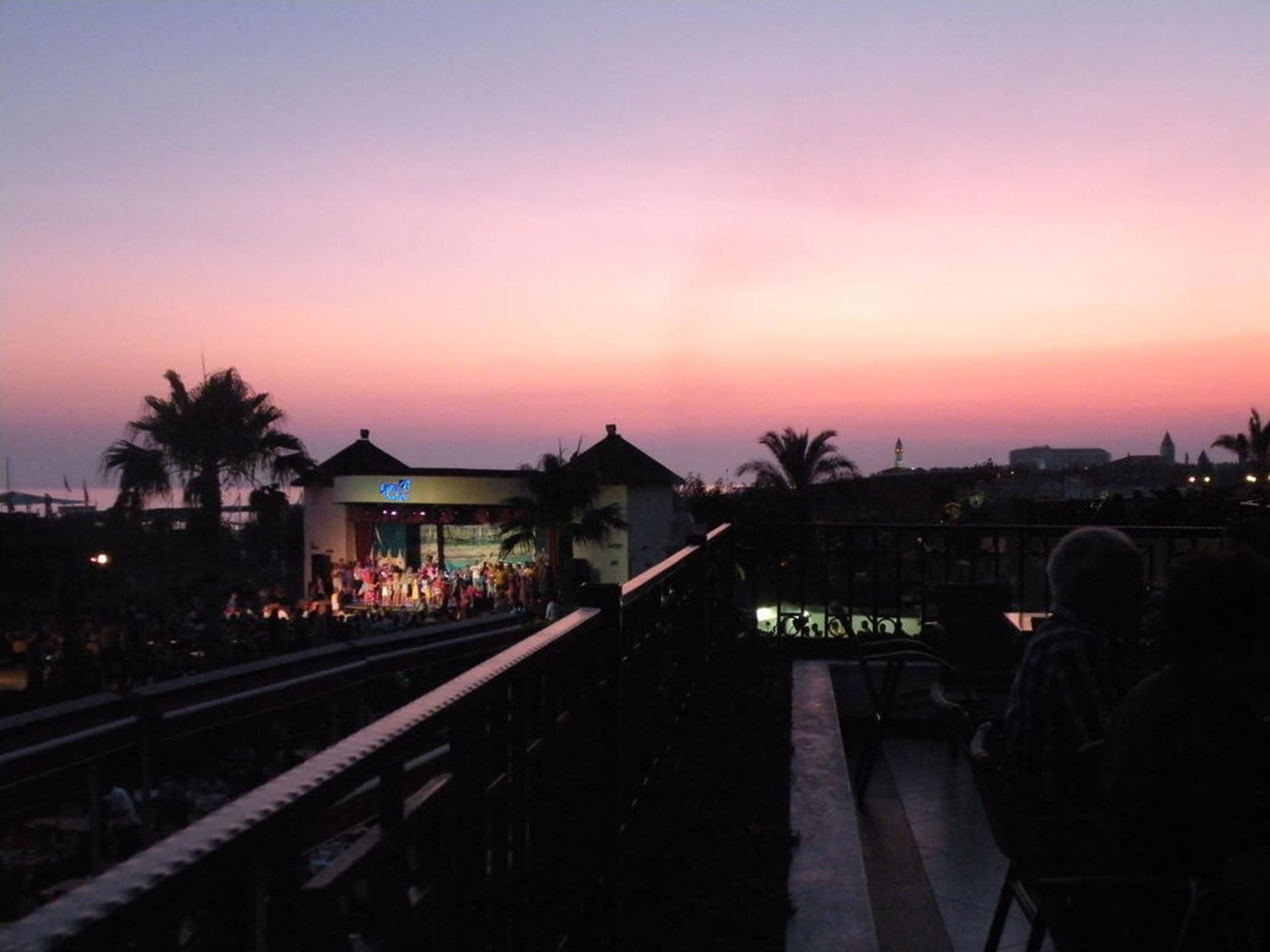 Terrasse der LobbybarDer Blick geht gegen den Sonnenuntergang von der Terasse der Lobby Bar. Des weitern ist auch das Amfitheater wo allabendlich Shows stattfinden zu sehen.