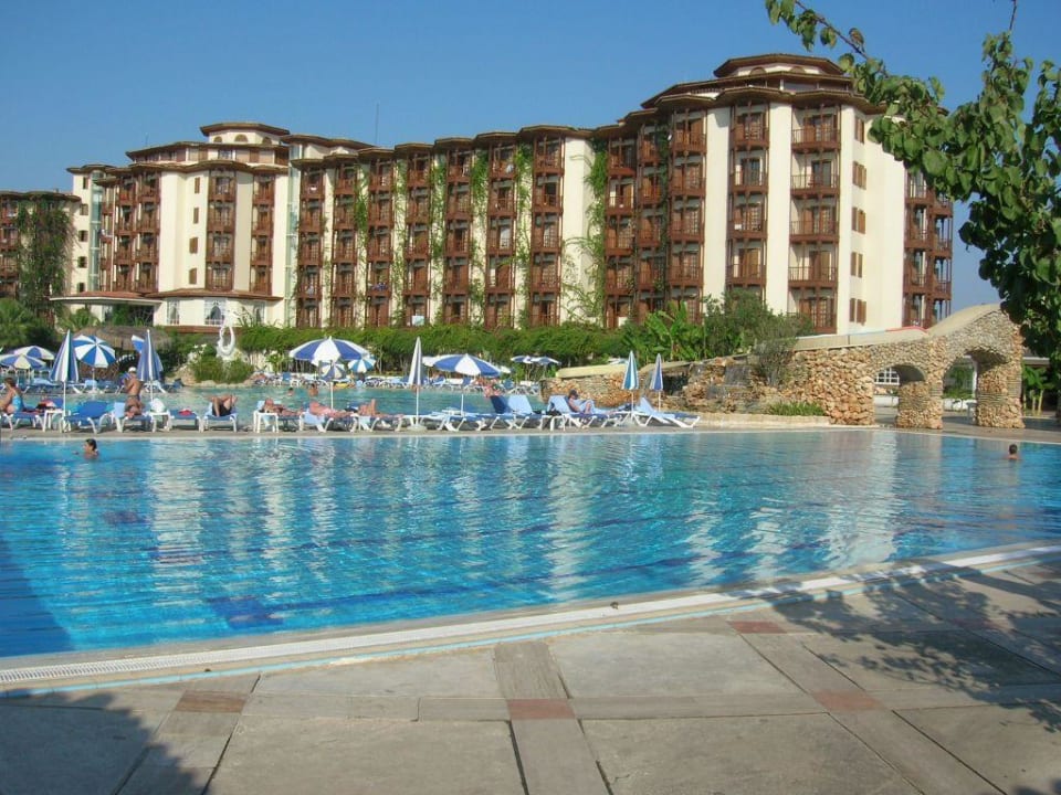 Pool-/ HotelanlageVom Showtheater geht der Blick über die Poolanlage zum Hotelgebäude, nicht zu verwechseln mit den Bungalows.