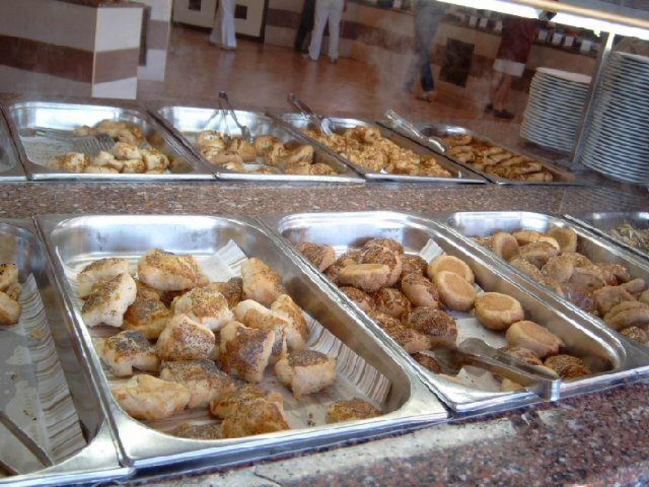 Angebot warmes Gebäck morgens. Dies ist eine der 2 Theken aus meiner Beschreibung wo es abends die 3 verschiedenen Hauptspeisen gibt plus Kartoffeln/Reis/Gemüse