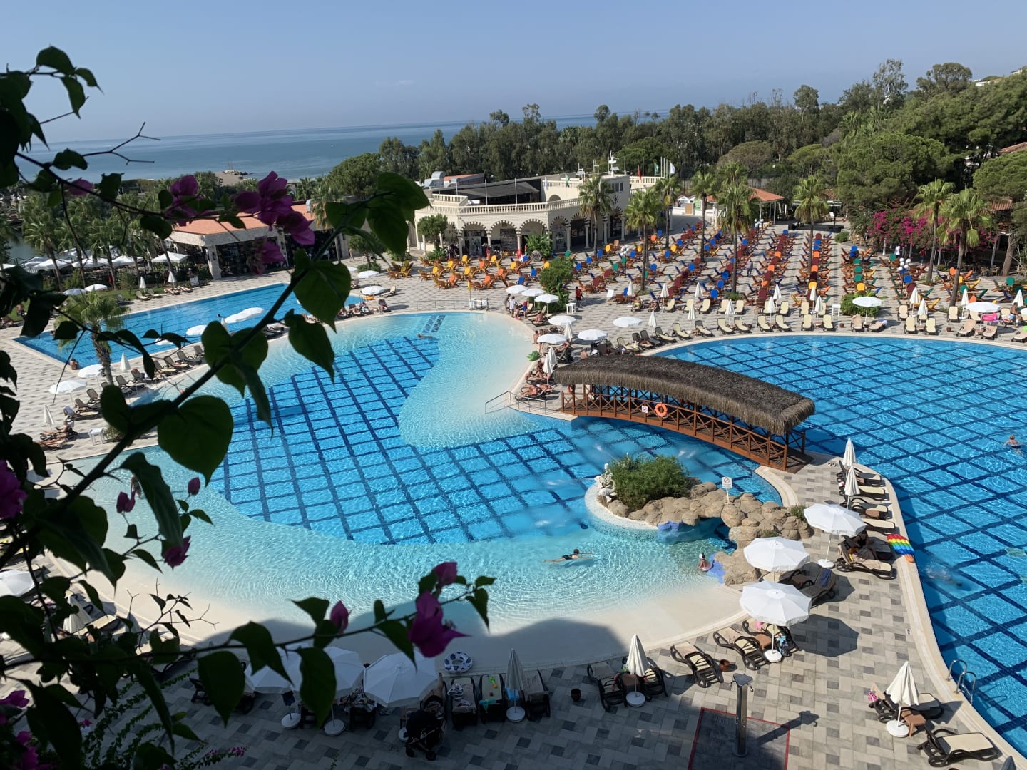 Blick von unserem Balkon auf Pool und Meer