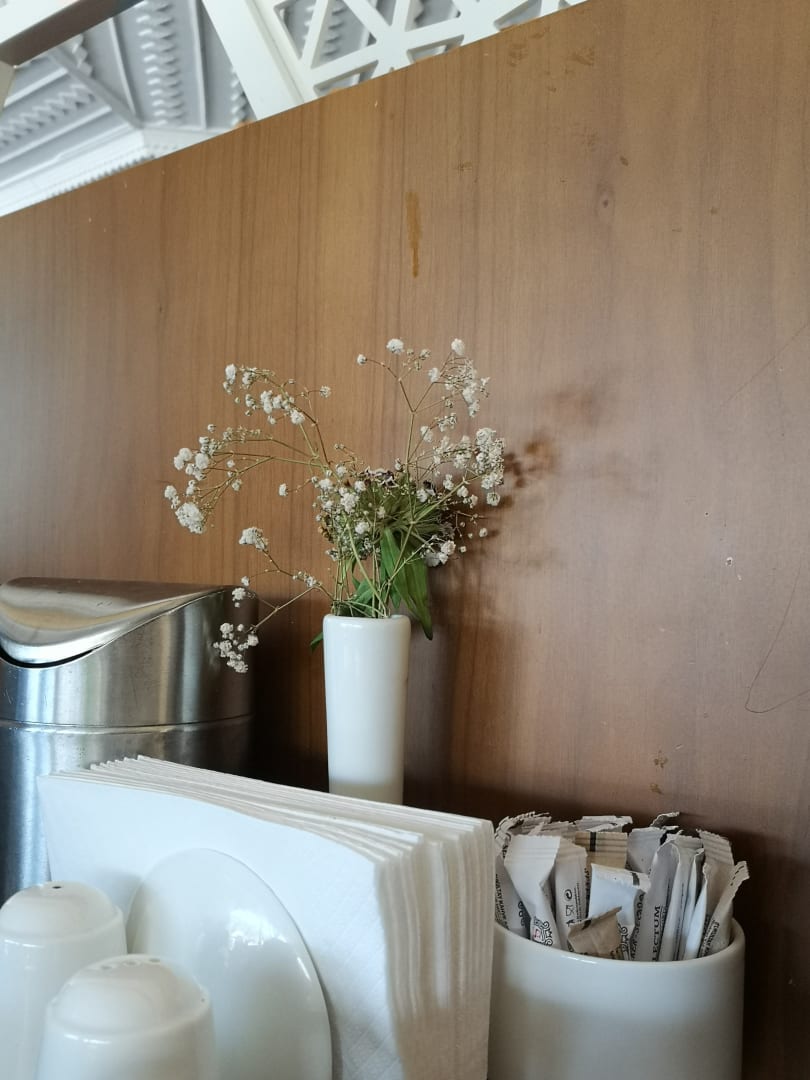 Im Speisesaal, die Holzverkleidung, ist nie gereinigt worden. Die Stühle auch nicht. Das übelste war der kleine Eimer. Die Nelken wurden Tage später dann ausgewechselt.
