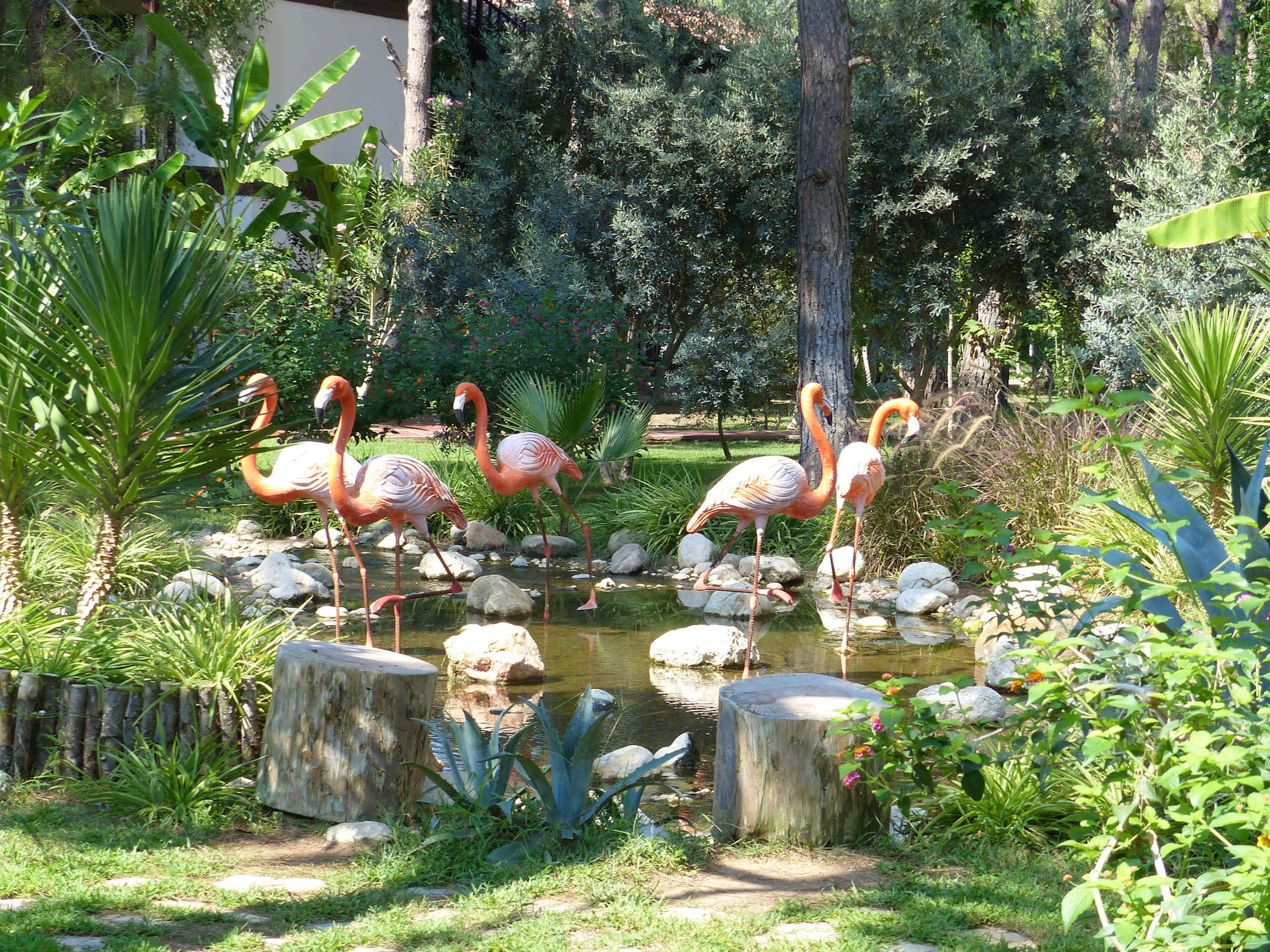 Immerwährende Flamingos im wunderschönen Garten