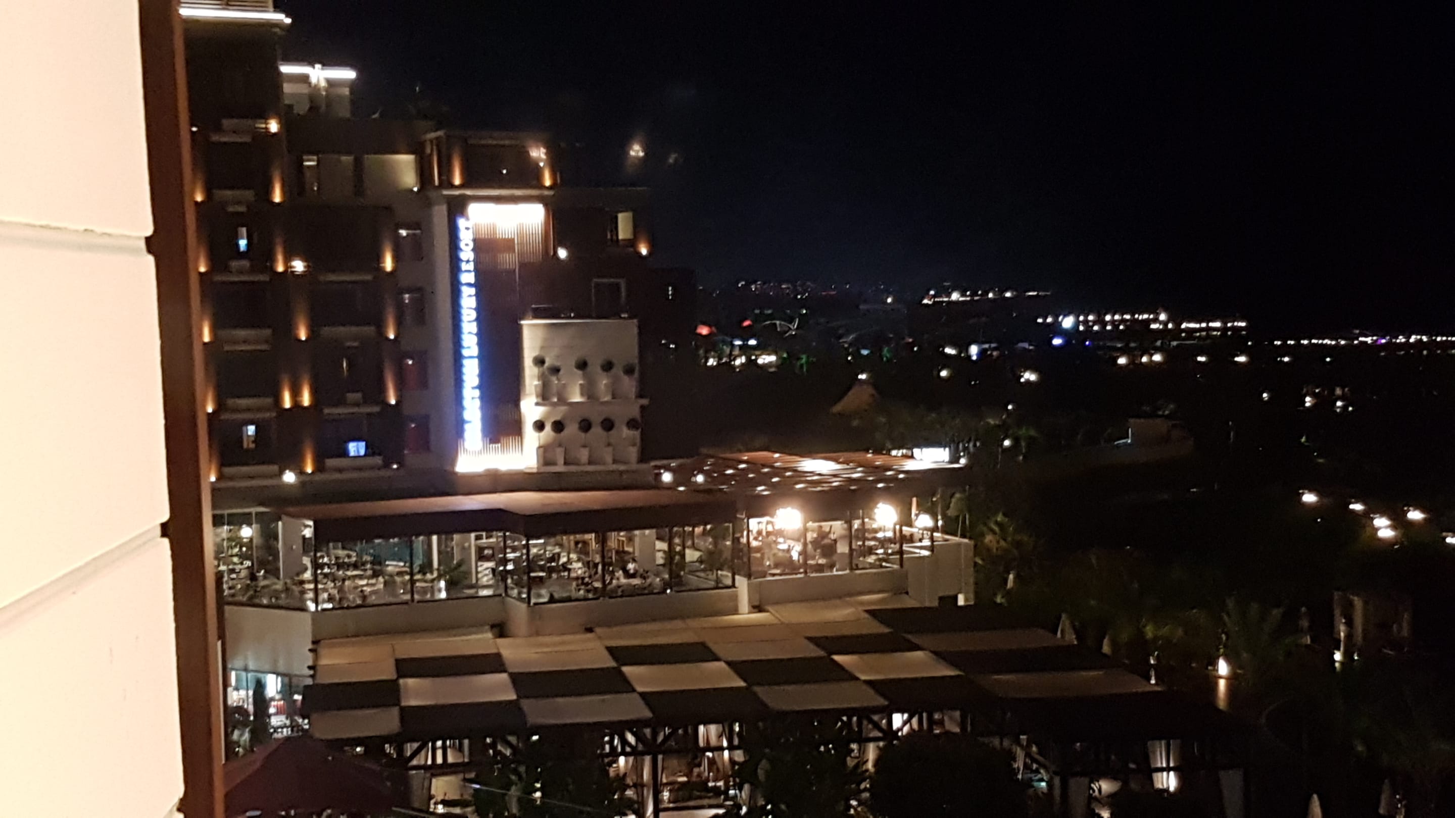Im Hintergrund Blick auf die Nachbarhotelanlagen. Mittig das 24h Restaurant