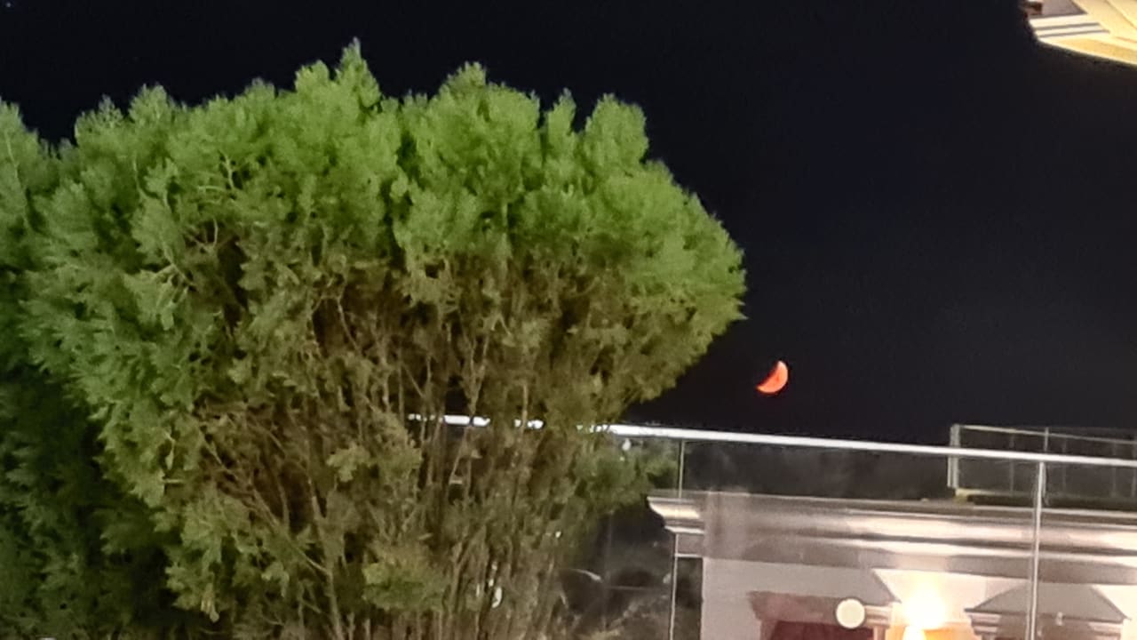 der Mond als Mandarine verkleidet von der Aussenterrasse der Lobby-Bar