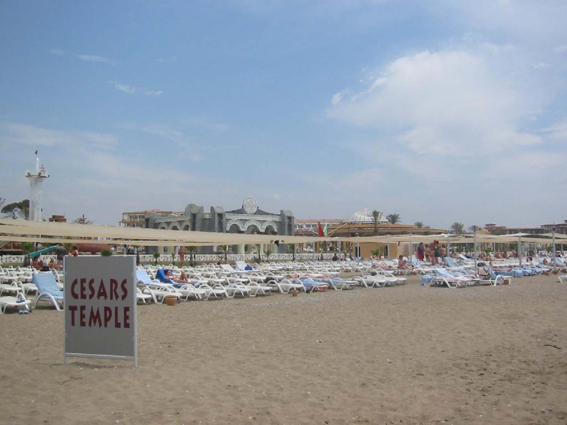 Sandstrand des Cesars TempleSehr breiter und mit Sand aufgefüllter Strand, mit gespannten Sonnensegeln und kostenfreien Liegen. Für das Baden, besonders mit kleineren Kindern, sind wegen den teilweise scharfkantigen Kieselsteinen, Badeschuhe zu empfehlen.