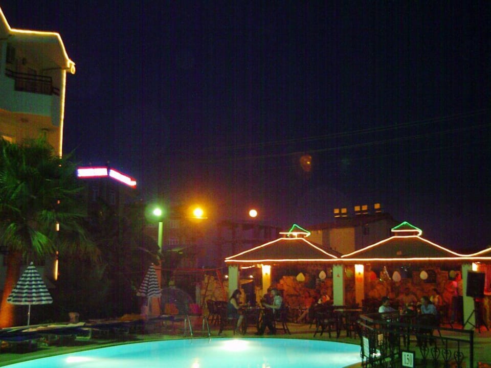 Poolbereich und Sitzbereich der Poolbar am AbendHier einen Blick am Abend auf den Pool und den Sitzbereich an der Poolbar später am Abend. Das Hotel ist mit Lichtschlangen dekoriert, ebenso die Überdachung an der Poolbar. (Anmerkung: in der Mitte des Bildes sieht man eine grüne Lampe links, eine gelbe in der Mitte und rechts das -fast- weiße ist der (Voll-)mond..)