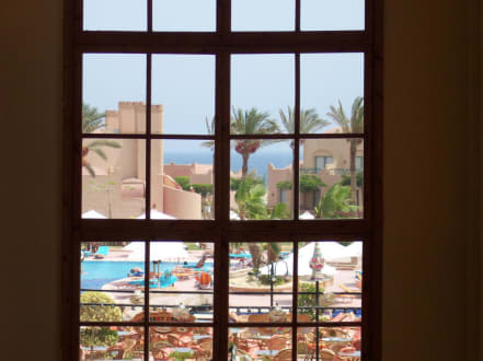 Blick vom Haupthaus auf den Pool