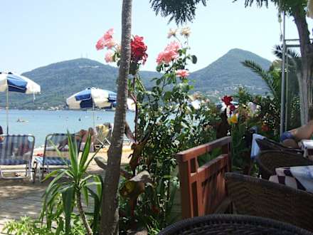 Blick von der Familytaverne am StrandEin schattiger Platz in der Taverne direkt am Strand mit schönem Blick auf die Berge Boukaris.