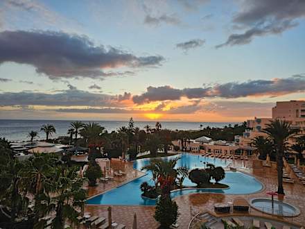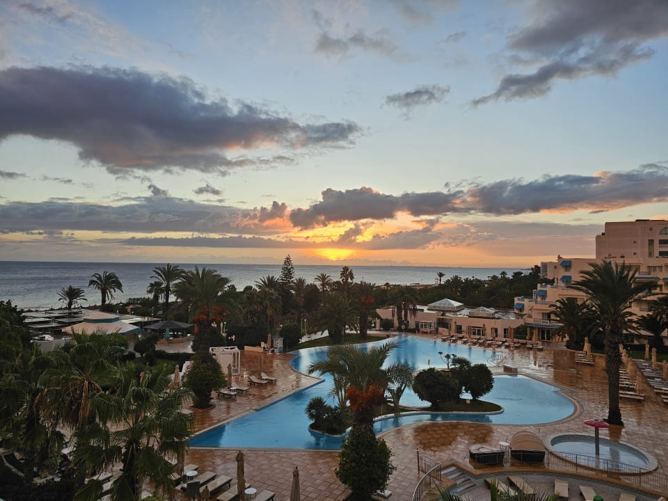 Sonnenaufgang vom Balkon mit auf die Poolanlage
