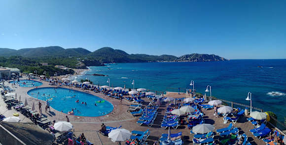 Der Hotelpool mit dem Ausblick auf die Bucht Es Figueral. Ein Traum!