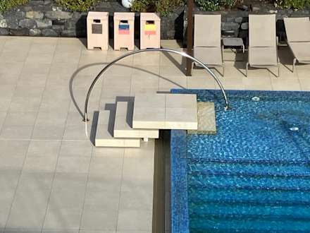 PoolOptisch sehr schön, aber ein Sicherheitsmangel: Die Fliesen sind glatt und haben keinerlei Anti-Rutsch-Kanten. Die nur einseitige Führung ist optisch schön, aber folgt nicht der Treppe als Halterung. Man erkennt auch schön die grünen Veralgungen.
