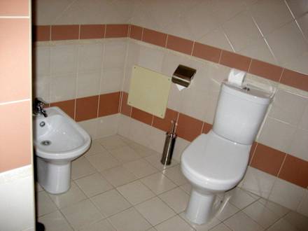 WC und Bidet ist durch eine Trennwand (links im Bild) vom Waschbereich abgeteilt.