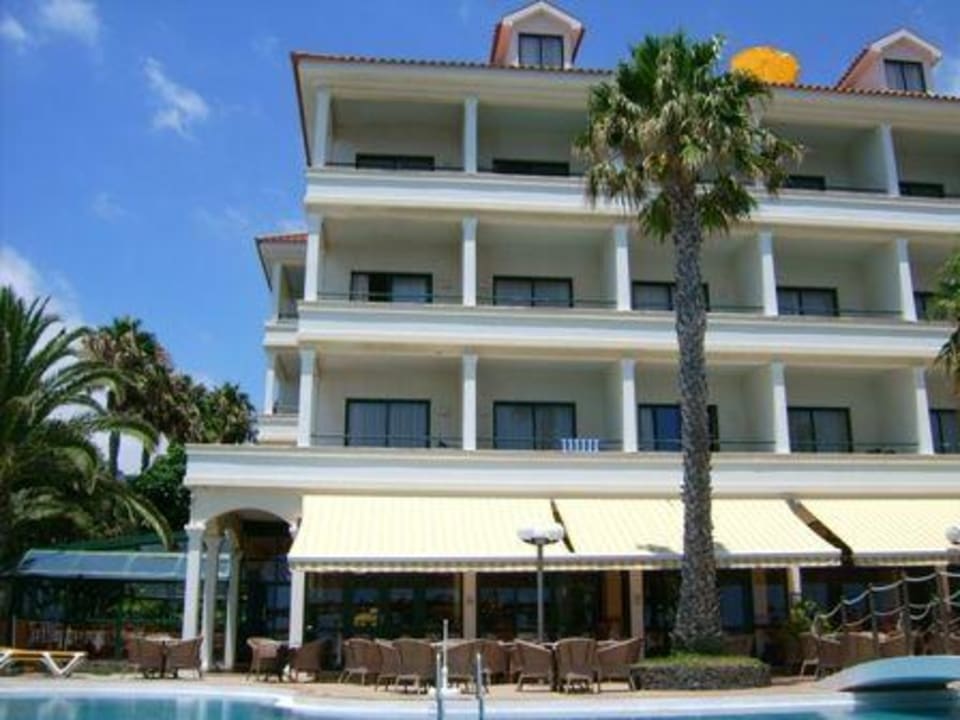 Blick von der Terrasse des Sport Hotel Galosol über den Pool auf das Haupthaus