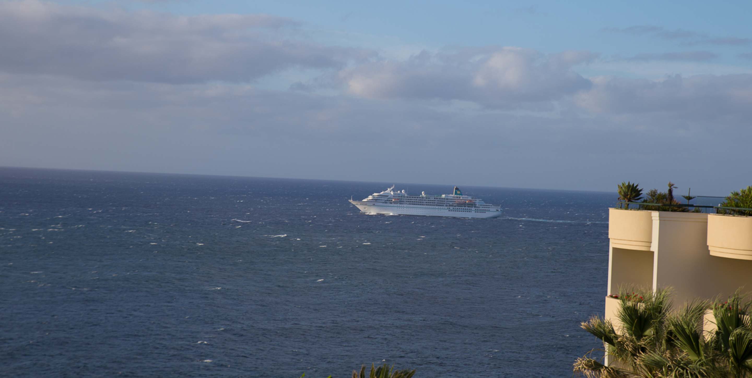 Auslaufendes Kreuzfahrtschiff von der Terasse aus.