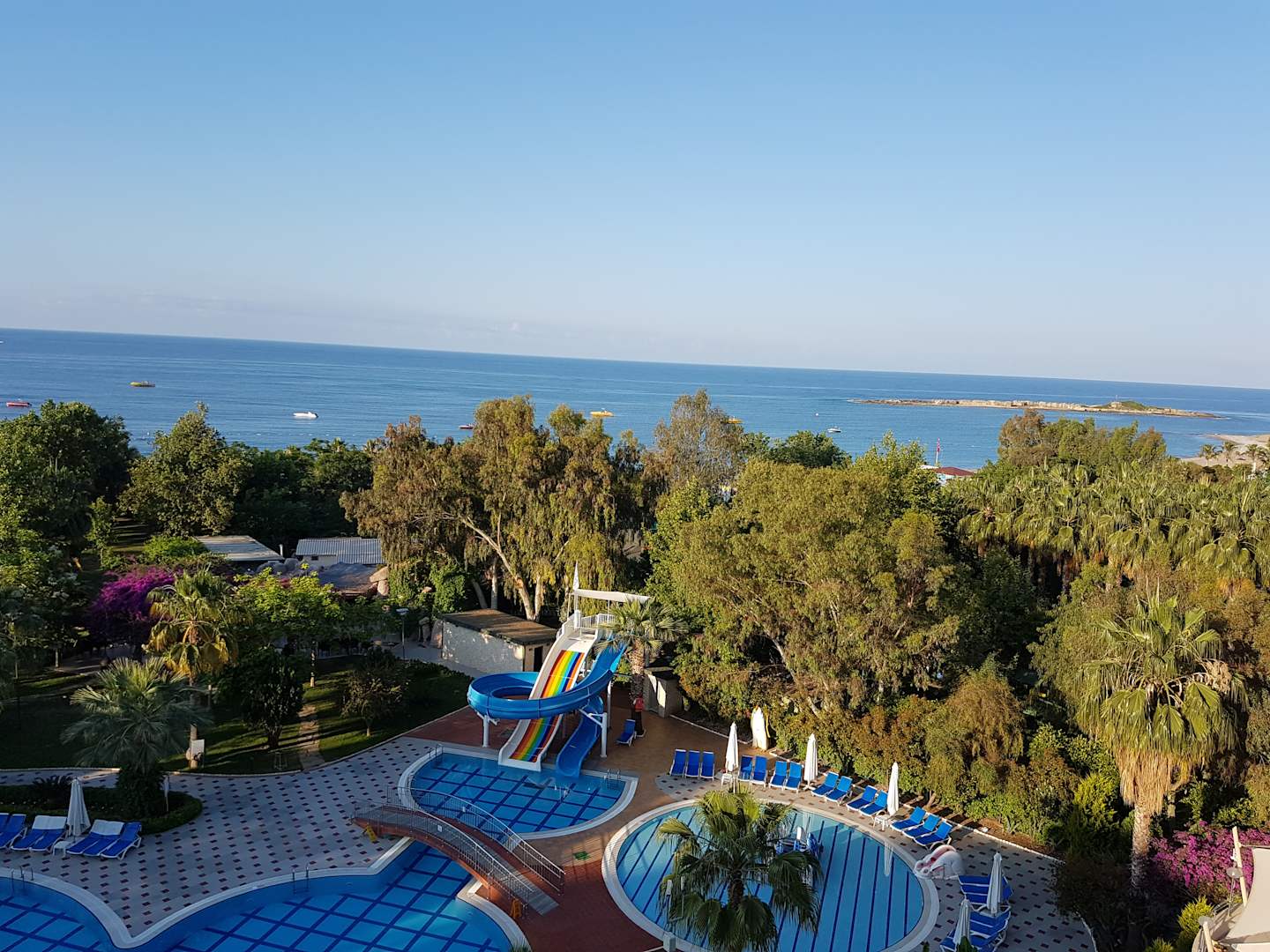 morgendlicher Blick vom Balkon auf die Poolanlage, Poolbar und Strand.