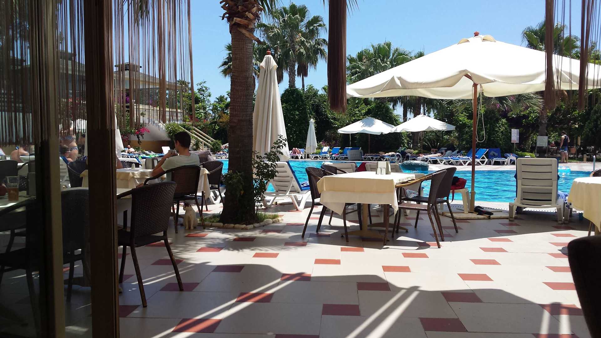 Blick auf die Terrasse und Pool