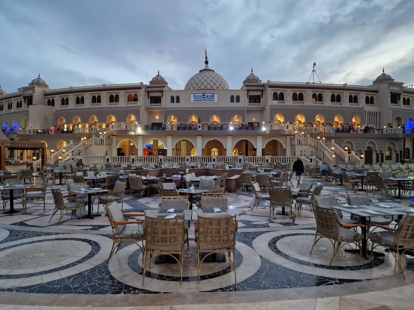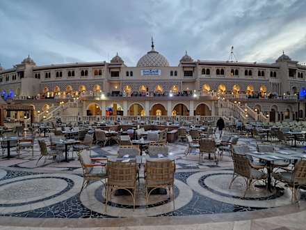 Hauptgebäude des Resorts mit Tischen für das Buffetrestaurant auf dem Platz