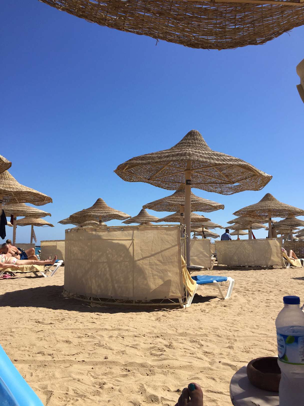 Strand mit reichlich Liegen und Schirmen