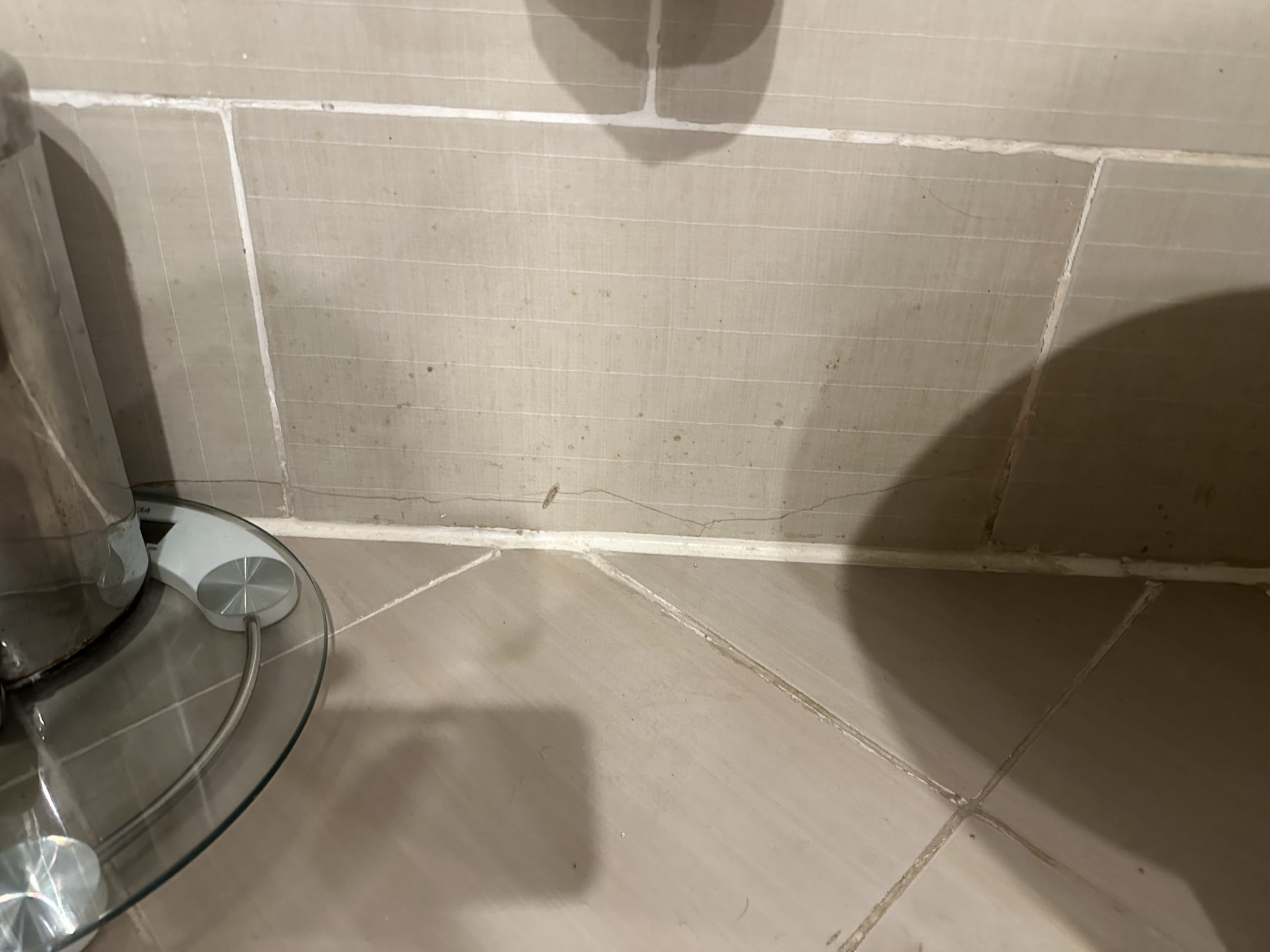 Wand neben Toilette. Die Flecken und Brocken lösen sich beim darüber reiben