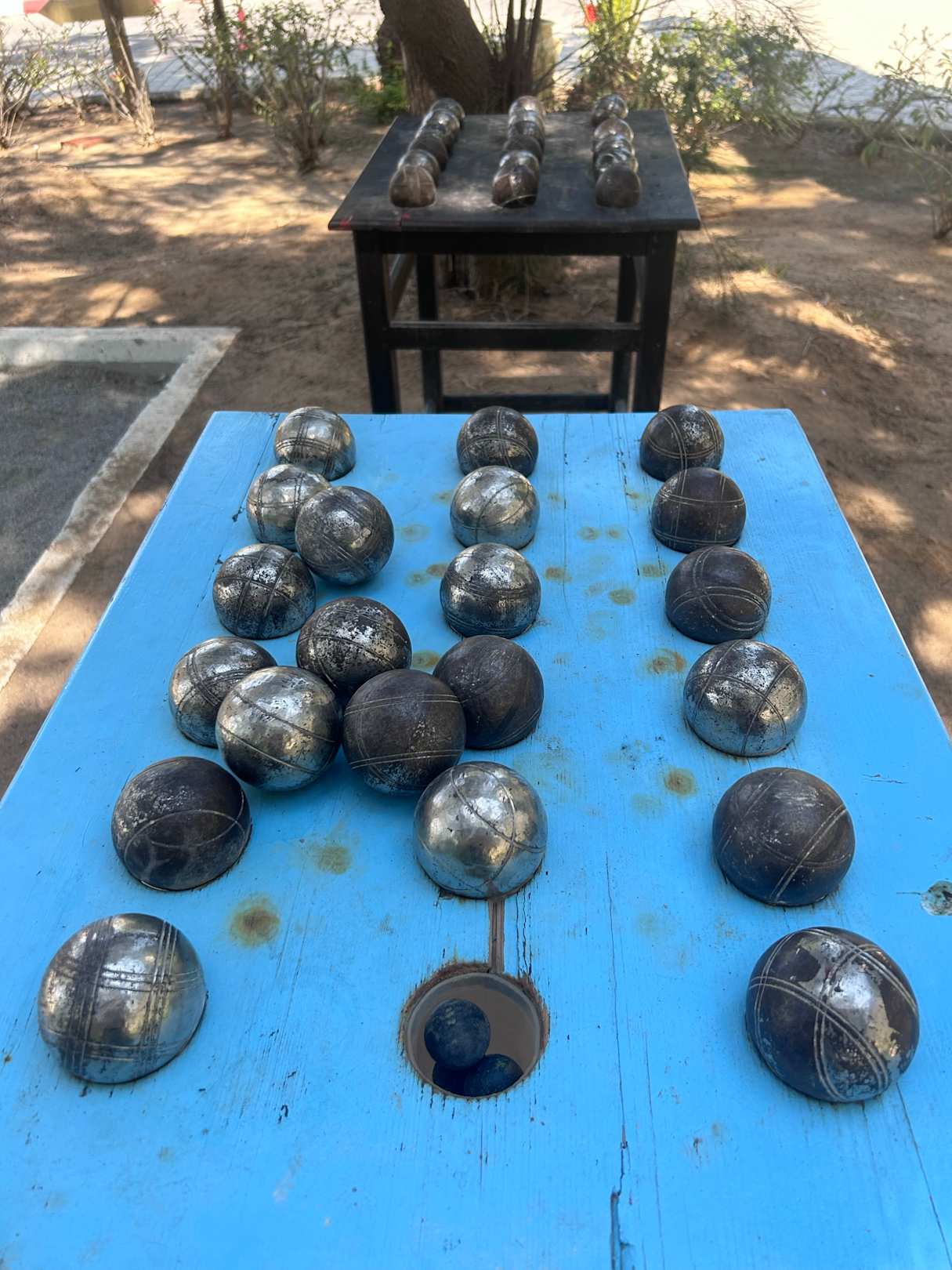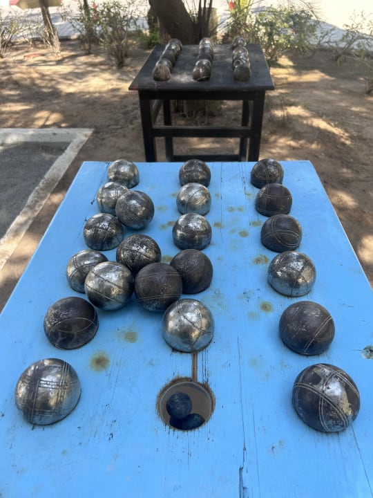 Bocciakugeln liegen bereit, man kann jederzeit spielen.