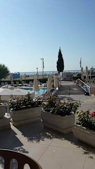 Aussenterassen blick auf Poollandschaft und das Meer.