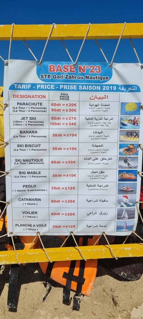 Preistafel für Aktivitäten am Strand