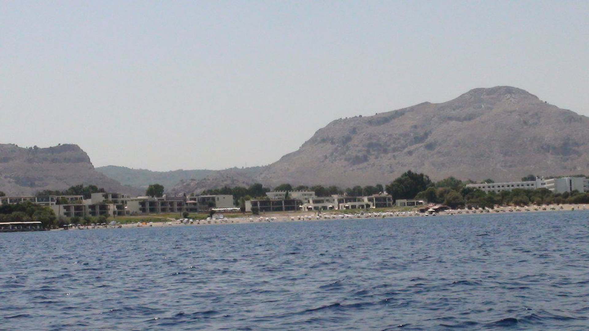 Ganz rechts im Bild ist das Nachbarhotel zu sehen, zwischen Nachbarhotel und Sensimar am Strand die Wassersportstation mit Bootsverleih, Jetski, Wasserski etc..