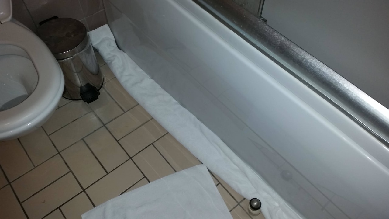 Beim Duschen lief, das Wasser unter der Wanne entlang, so das eine Wasserpfütze vor dem Waschbecken stand. Die Reinigungskraft hat ein großes Badetuch davor gelegt. Problem behoben.