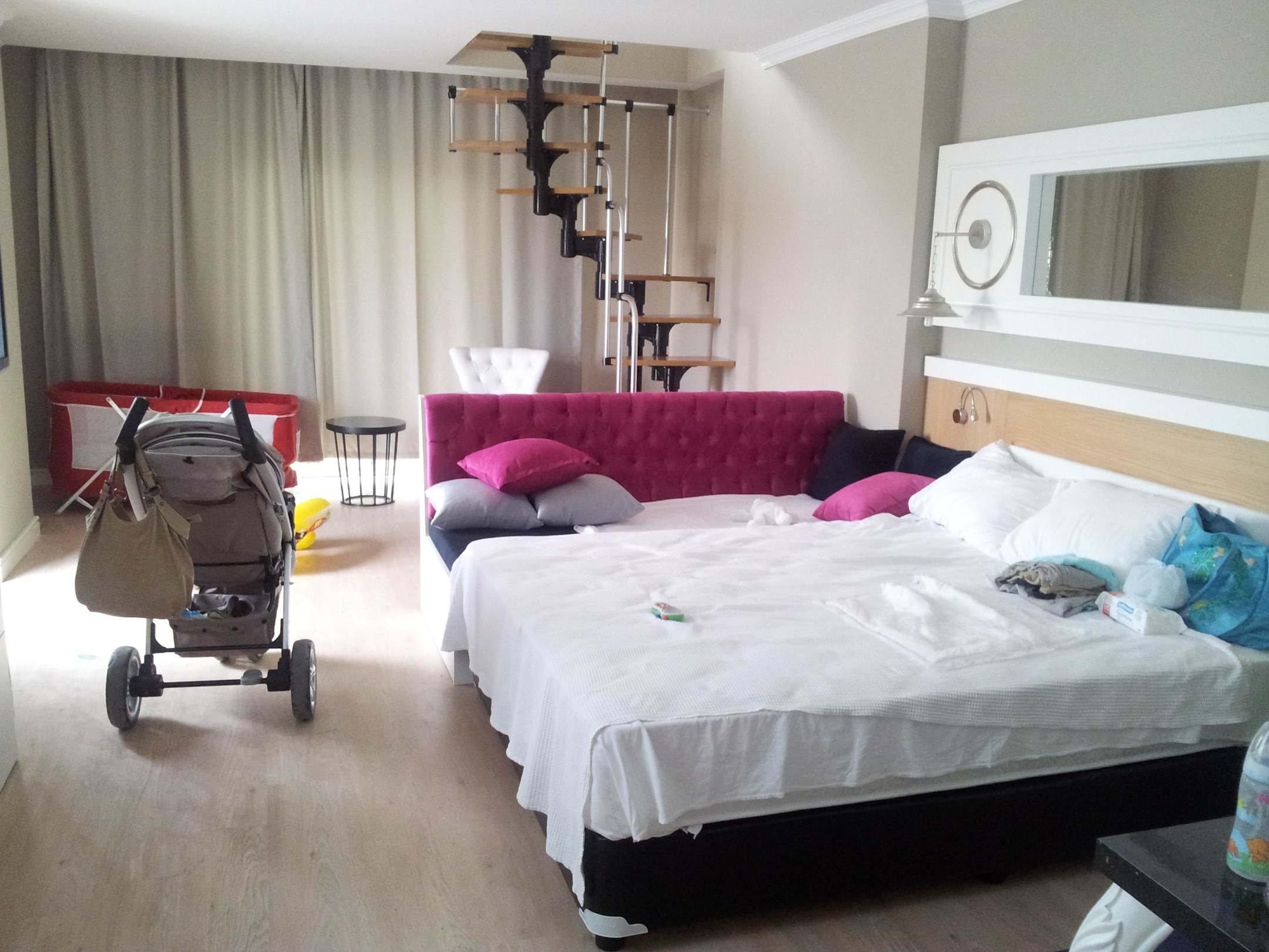 Unser erstes Zimmer..Unser erstes Zimmer,mit Treppe und zweistöckig.In der zweiten Etage Baustelle.Überall Staub und Schmutz von Bauarbeitern.Zimmer war ungeputzt.Mit einem 10 Monate altem Baby unakzeptabel.Haben am nächsten Tag neues,kleineres Zimmer Bekommen.