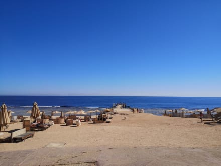 StrandBlick auf den Strand und den Steg, der zum Riff führt