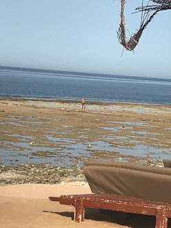 Das vorgelagerte Riff bei Niedrigwasser und eine der total heruntergekommenen Liegen, die sowohl am Strand als auch am Pool Standard sind. Am Pool blättert dann aber weiße Farbe ab.