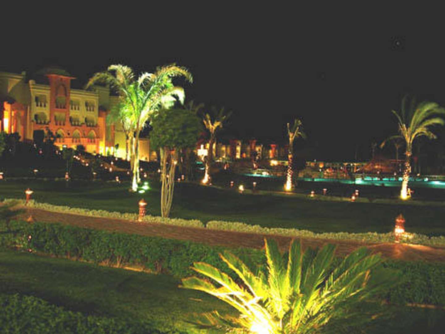 Nachtaufnahme HotelanlageDie unzähligen Palmen in der Hotelanlage geben ein stimmungsvollesBild ab.