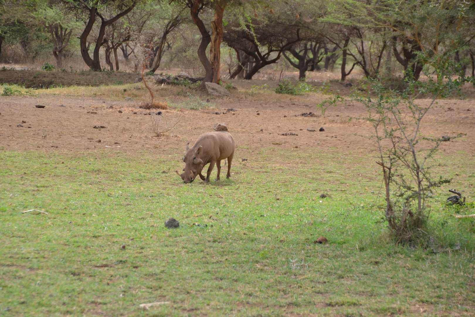 Warzenschwein beim Grasen im Garten