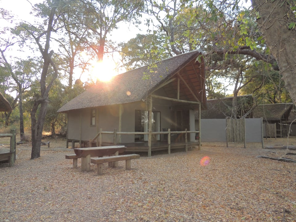 einzelstehende Bungalows mit Blick auf den Okavango
