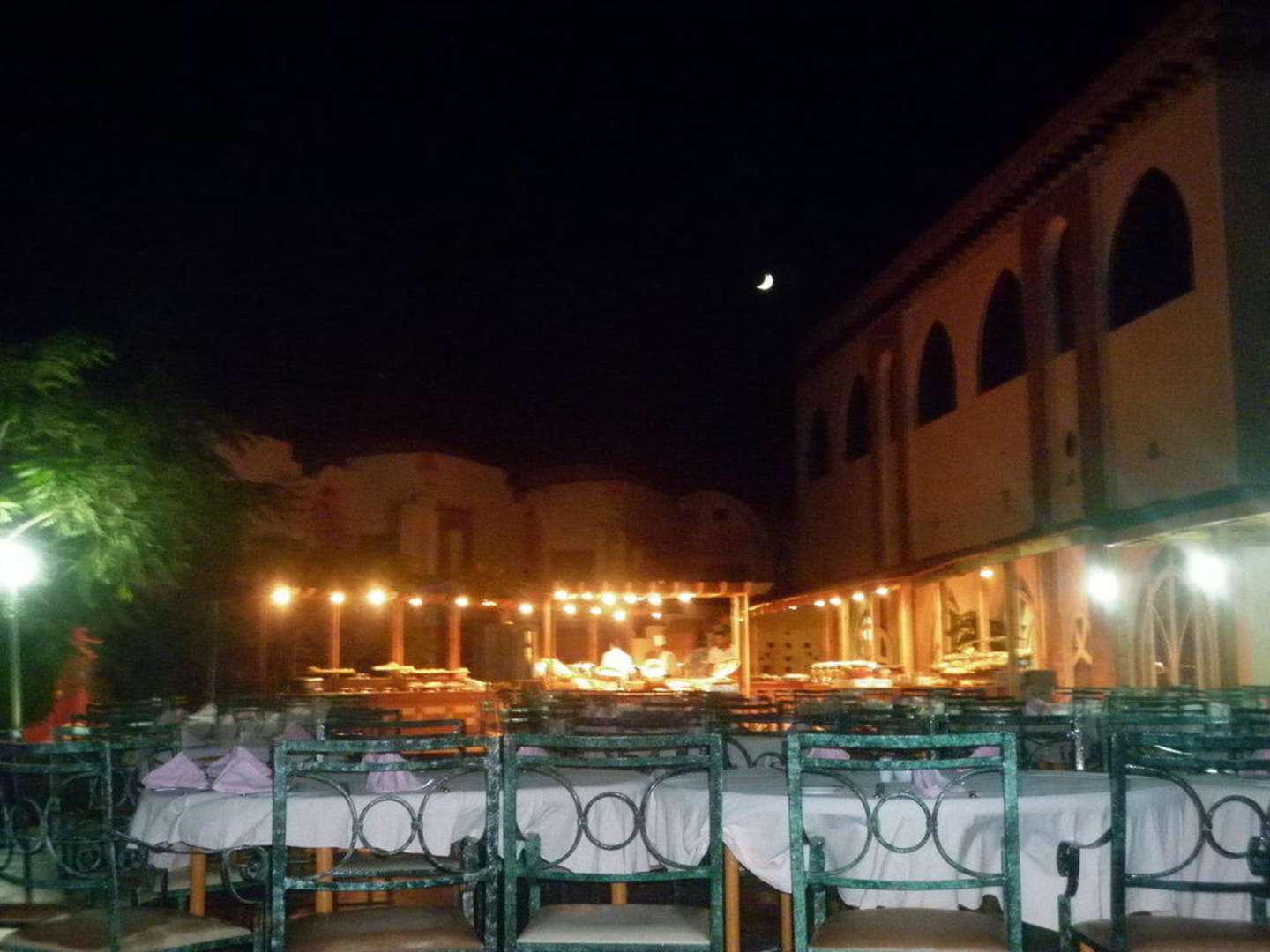 Aussenterrasse mit Blick auf das erleuchete Büffet