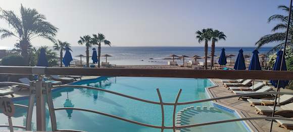 Blick vom Restaurant auf Pool und Meer