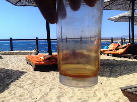 StrandSehr alte, verbrauchte und schmutzige Plastikbecher, die man bekommt, wenn man etwas zum trinken bestellt (all in).....