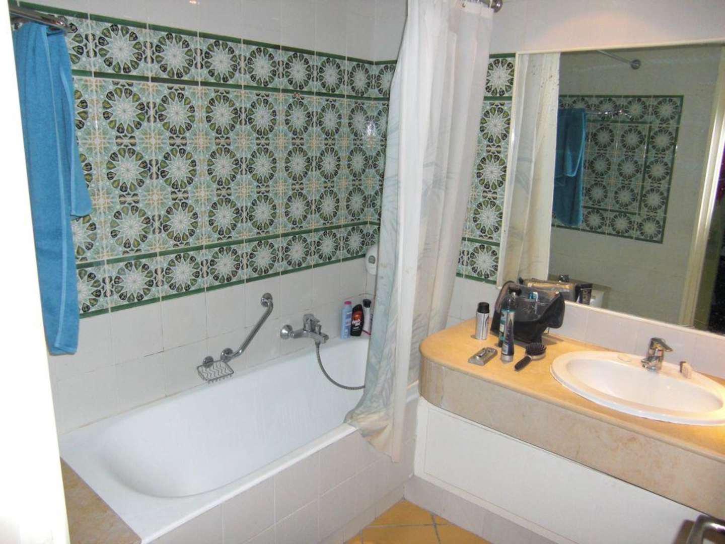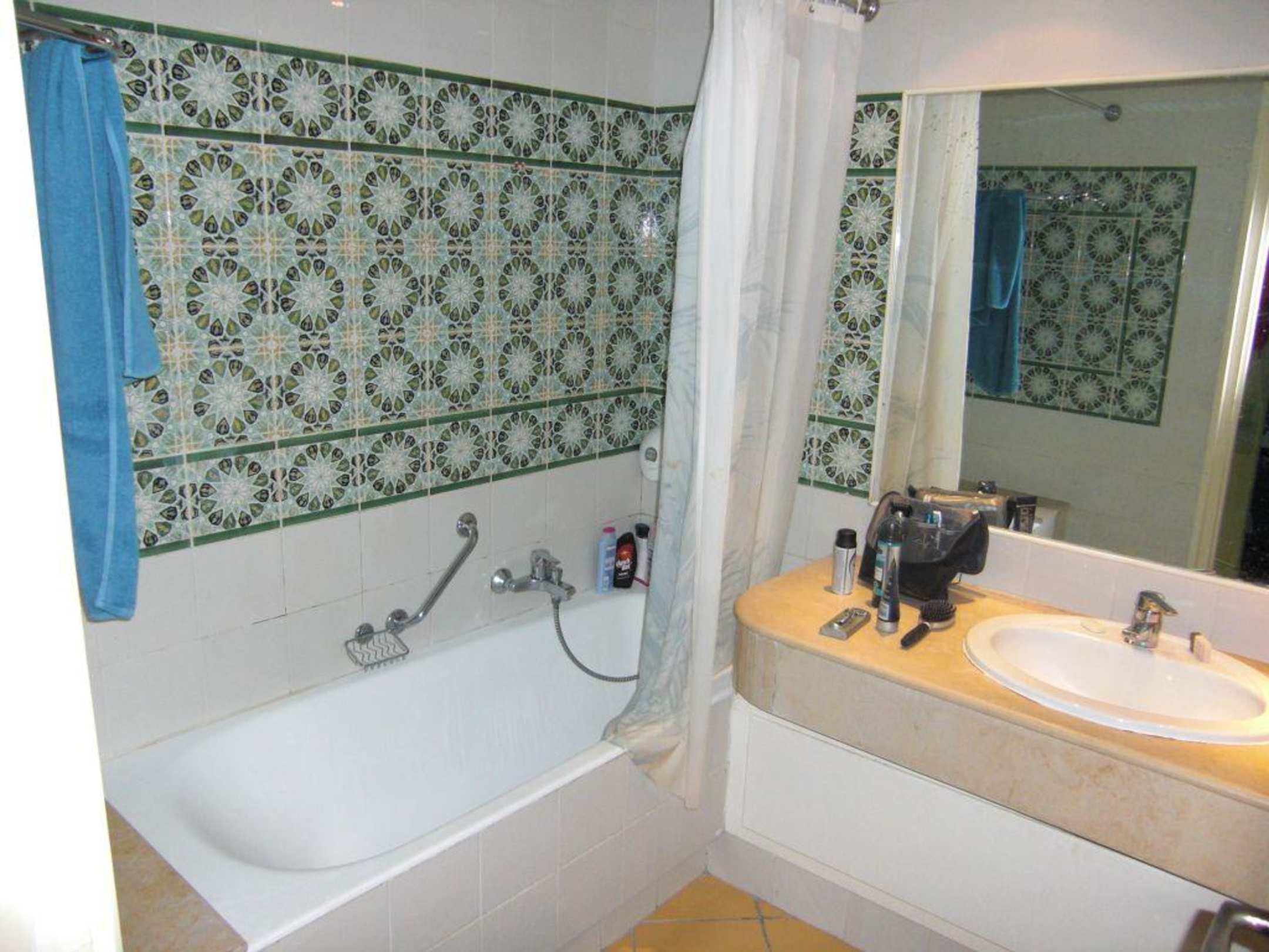 BadBadewanne mit Dusche,rechts davon waschbecken und daneben befindet sich die toilette