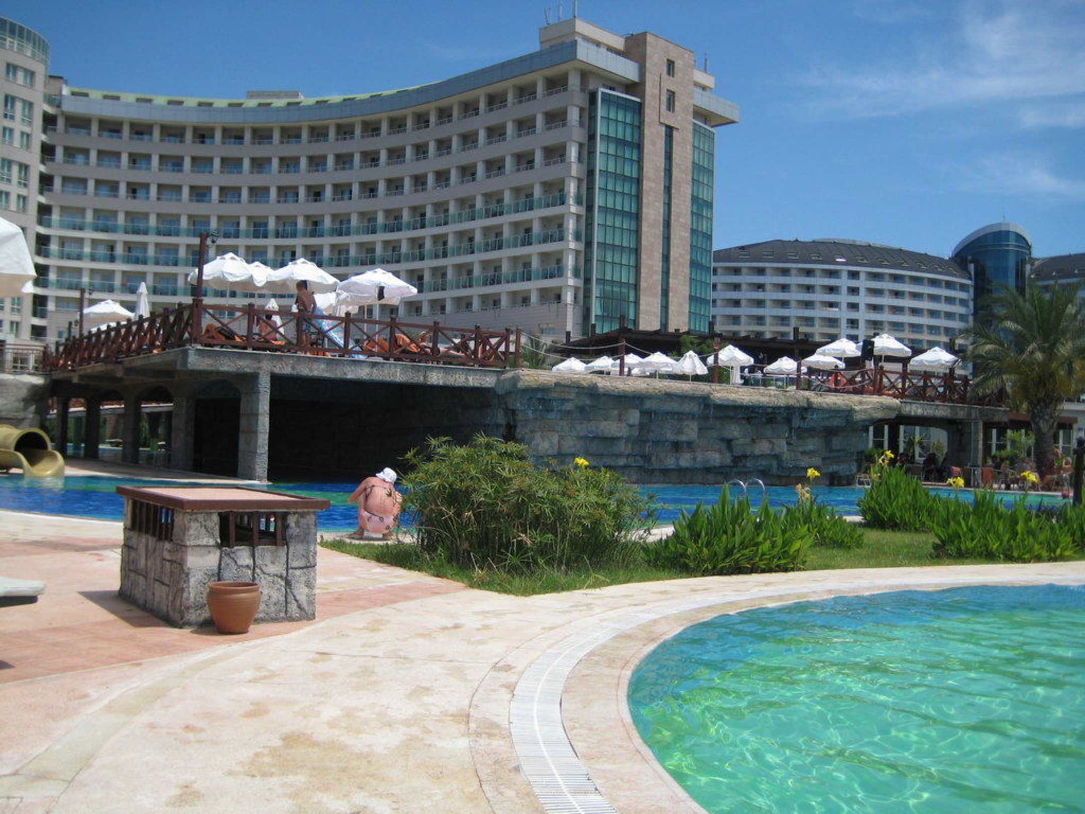 Blick vom Pool aufs Hotel