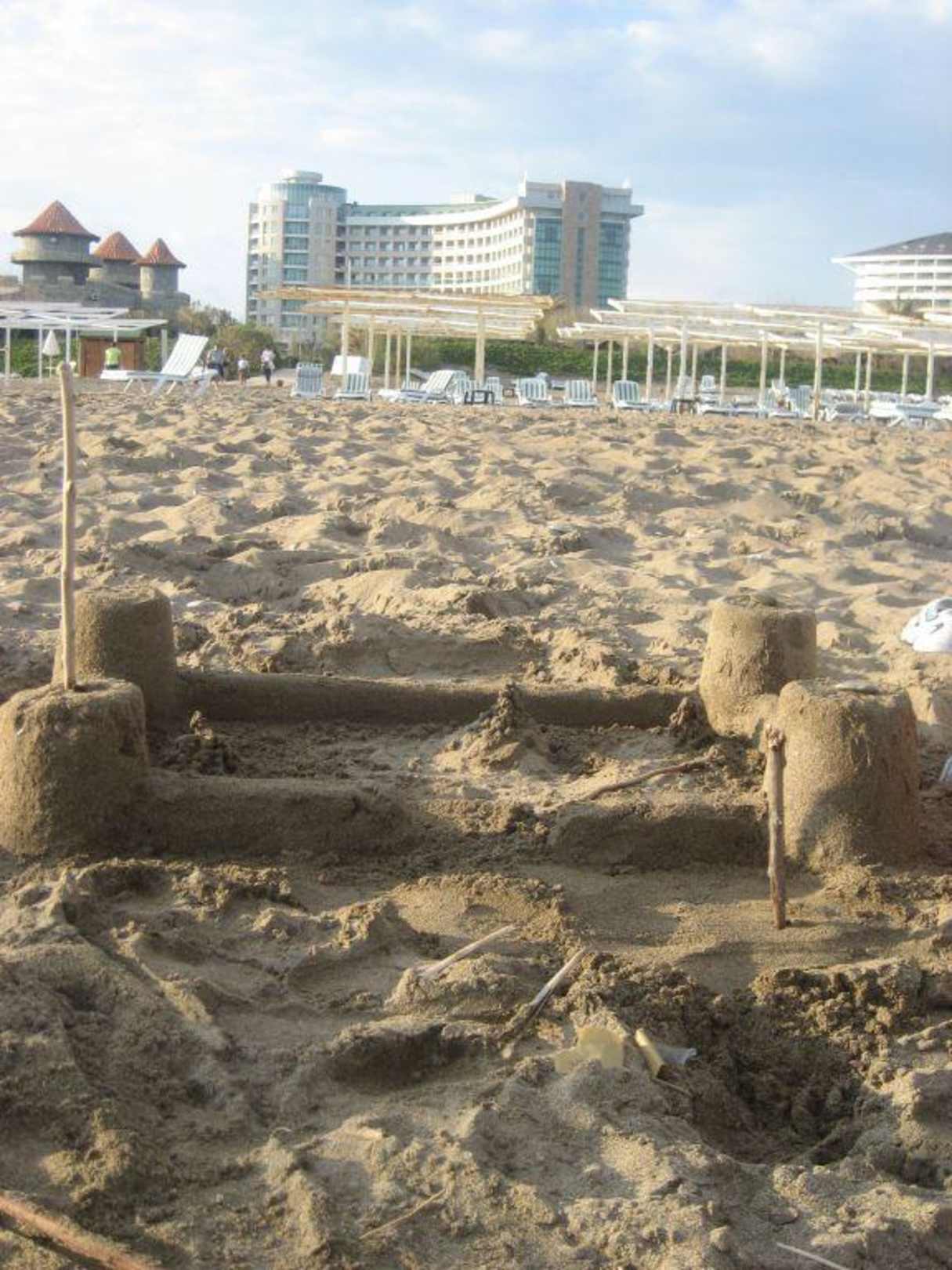 Sandburg am Strand im Hintergrund das Hotel