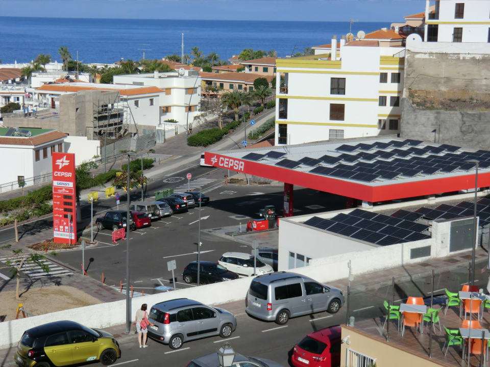Blick vom Balkon auf die Tankstelle und auch das MEER