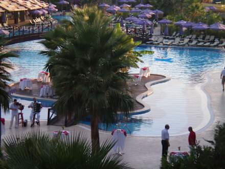 Blick vom Zimmer auf den Pool