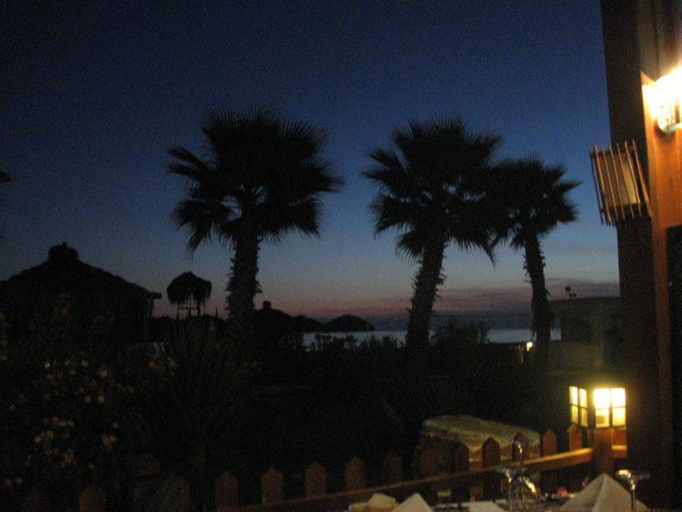 Ресторан “А-ля Карт”.Ужин оказался довольно вкусным, и, покушав, мы заказали по бокалу вина. Ресторан находился на самом берегу моря. На столе горели свечи. Был слышен шелест небольших волн, вокруг росли пальмы, а солнце уже почти скрылось за морем, оставив на воде тольк