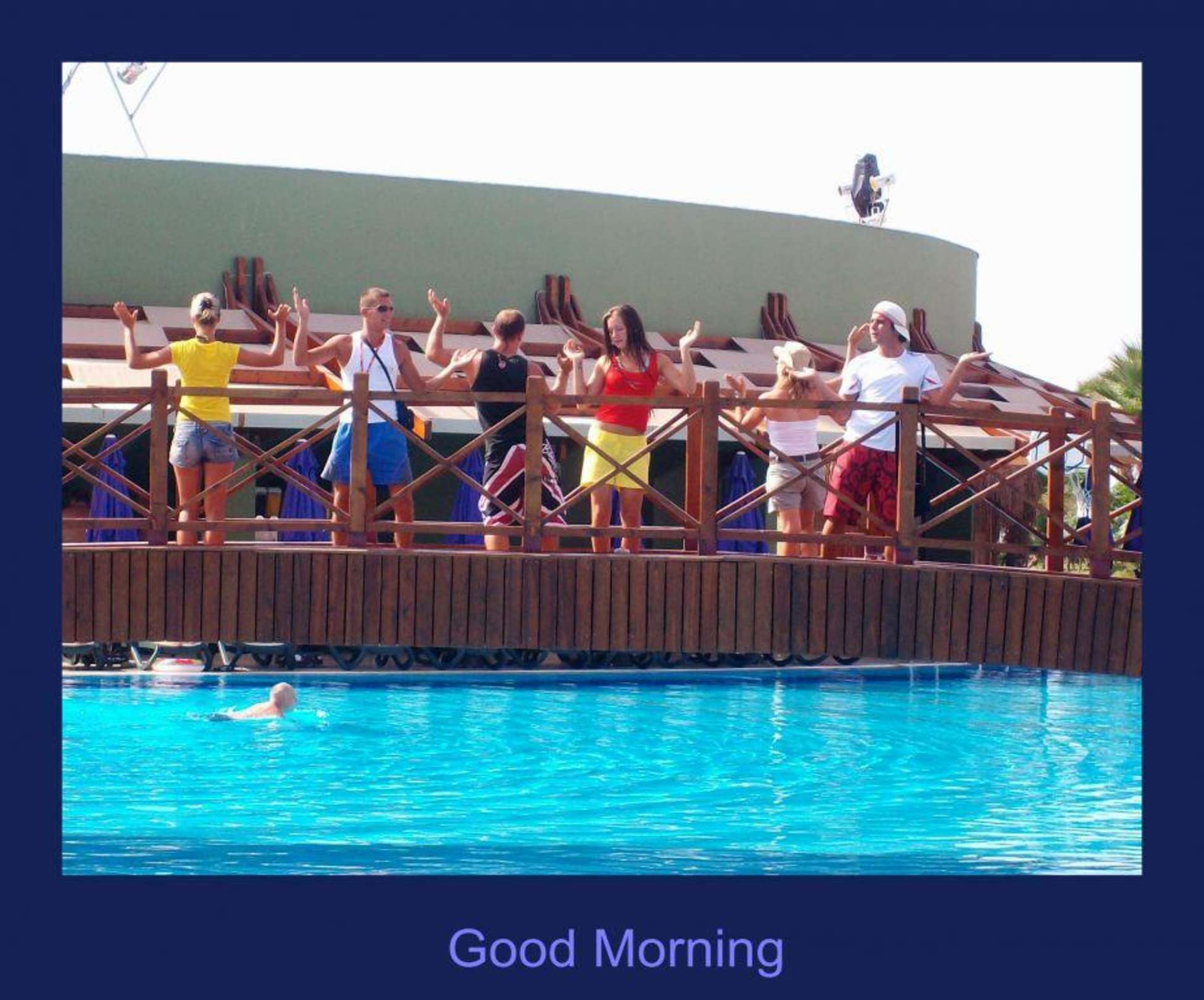 10.15 Uhr Good MorningJeden Morgen begrüssen die Animateure die Gäste von der Poolbrücke aus.